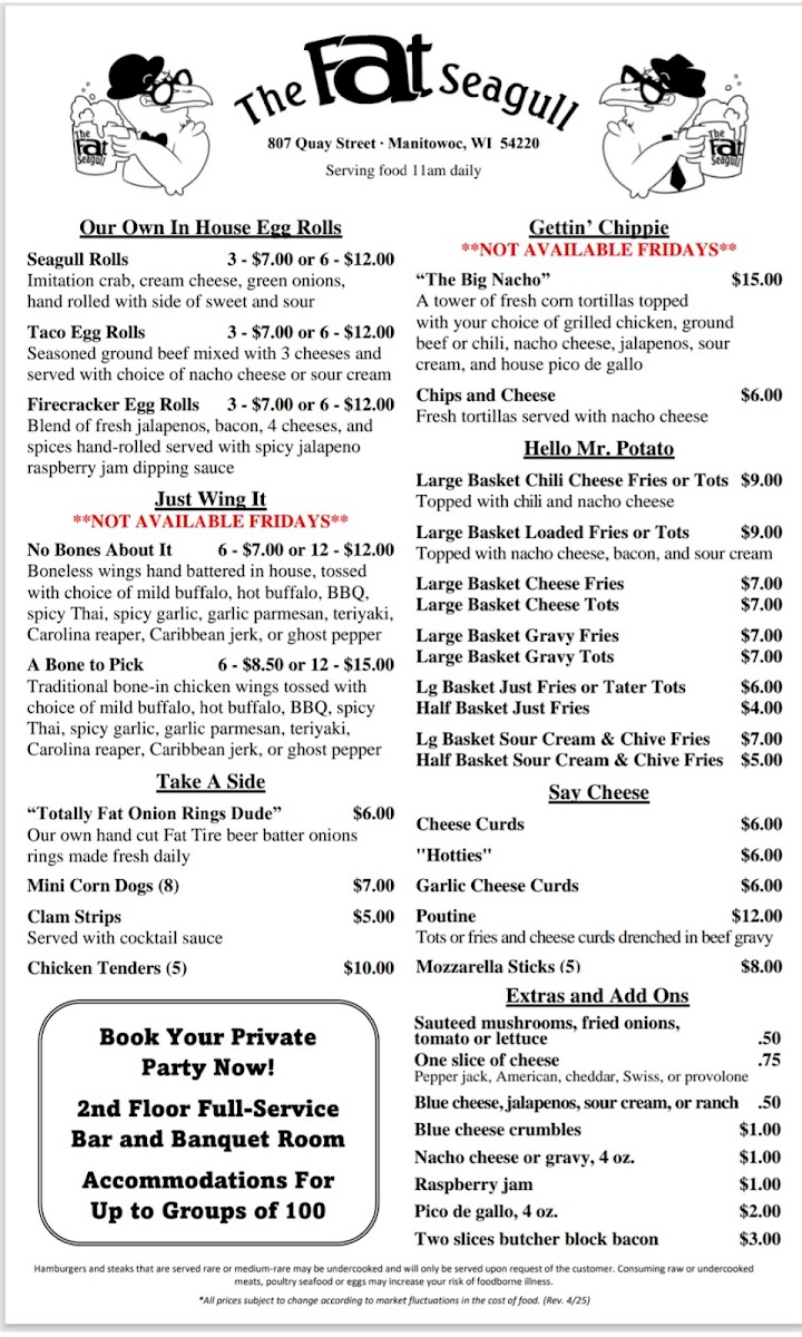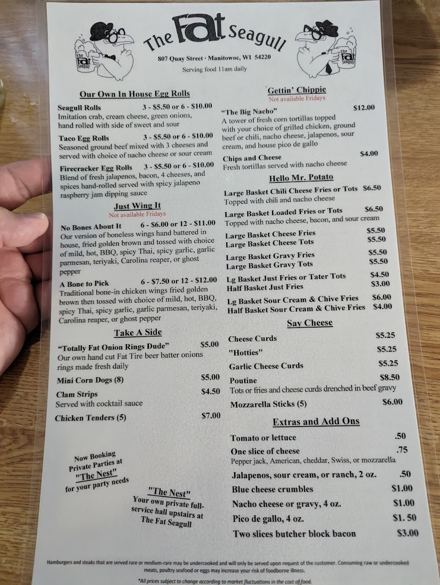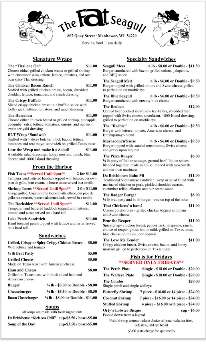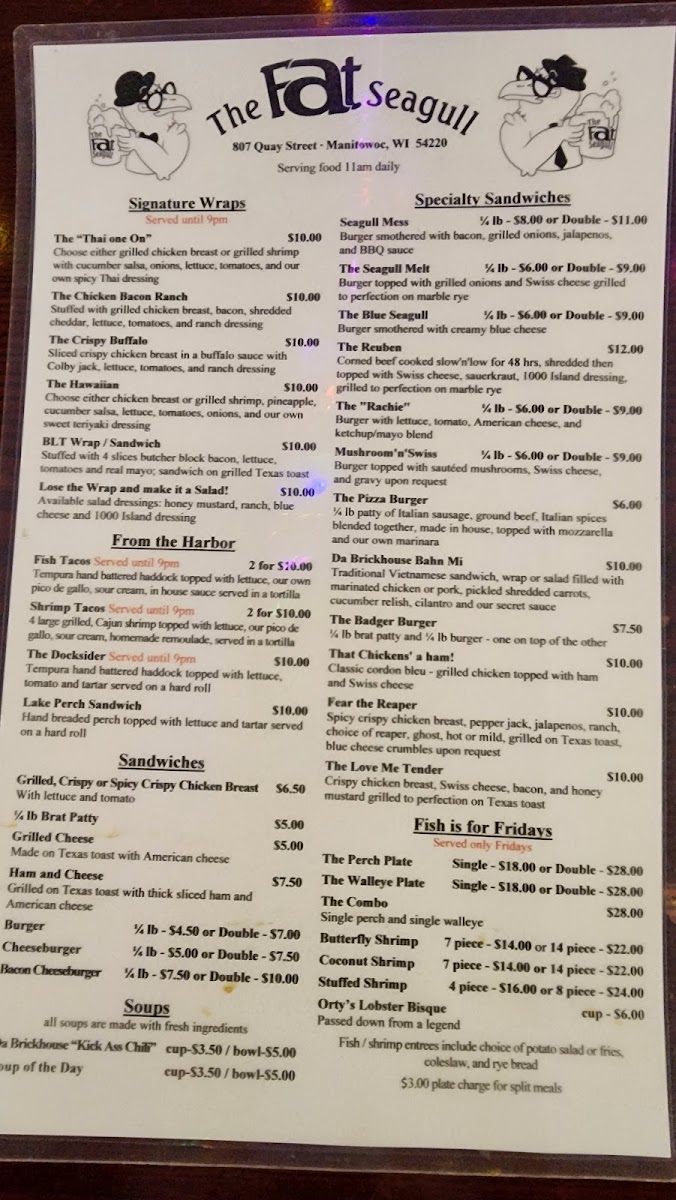 Located at 807 Quay St in Manitowoc, WI, The Fat Seagull is where the spirit of a classic Wisconsin dive bar comes to life. This welcoming establishment offers a delightful escape with a cozy atmosphere, highlighted by numerous Packer displays and friendly chatter among patrons and staff alike. The menu is a celebration of well-crafted bar food that exceeds expectations.