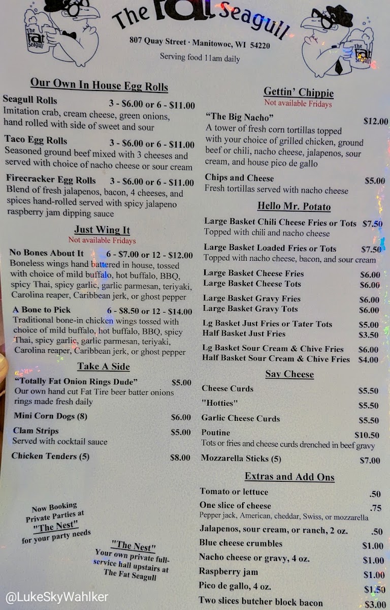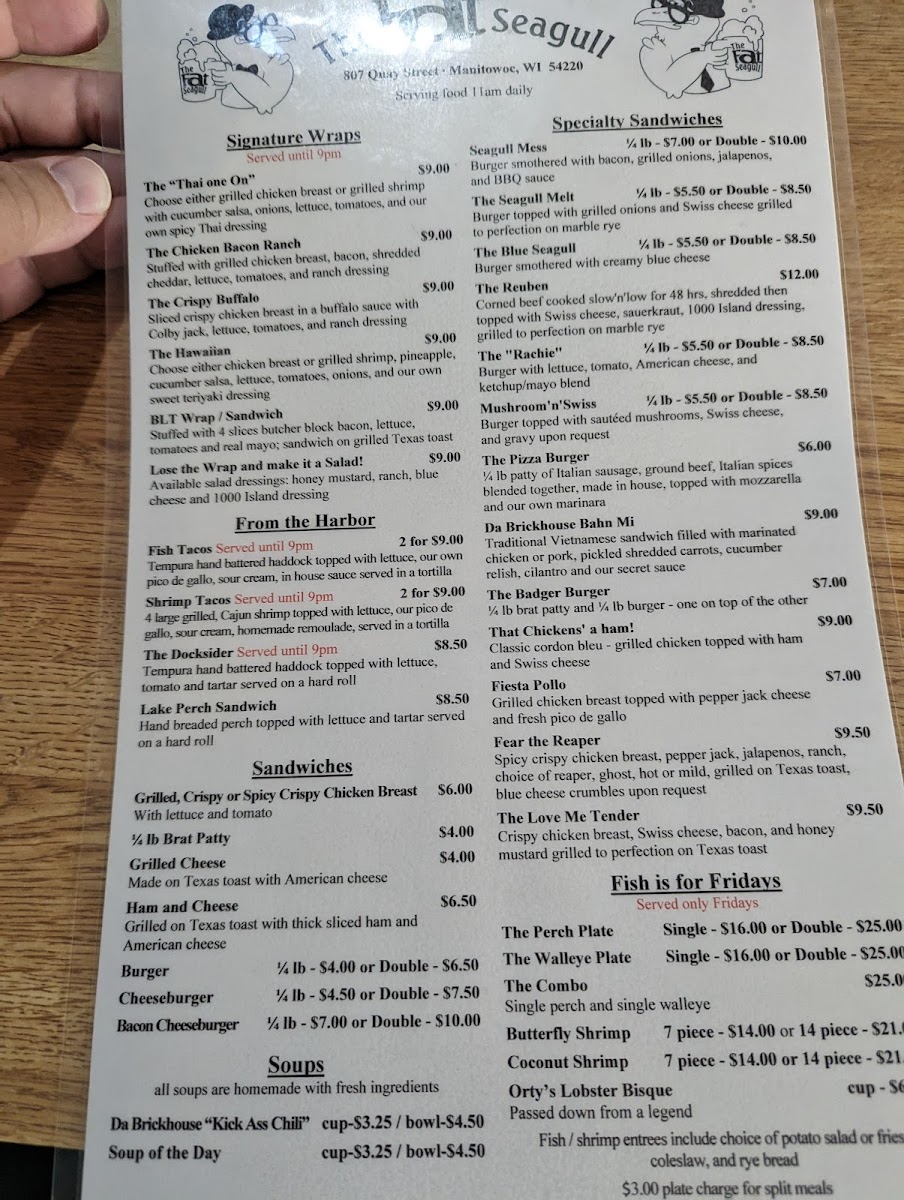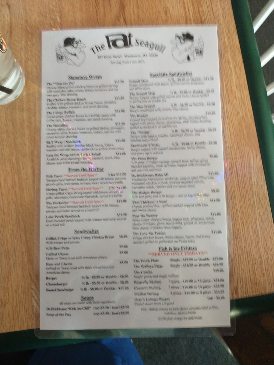 Located at 807 Quay St in Manitowoc, WI, The Fat Seagull is where the spirit of a classic Wisconsin dive bar comes to life. This welcoming establishment offers a delightful escape with a cozy atmosphere, highlighted by numerous Packer displays and friendly chatter among patrons and staff alike. The menu is a celebration of well-crafted bar food that exceeds expectations.